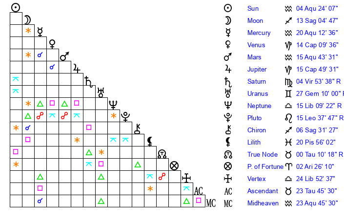| Neptune | 15 Libra 9 | 27 Pisces 46 | 13 Libra 37 |