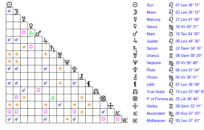 | Pluto | 6 Leo 52 | 2 Aquarius 25 | 8 Leo 40 |