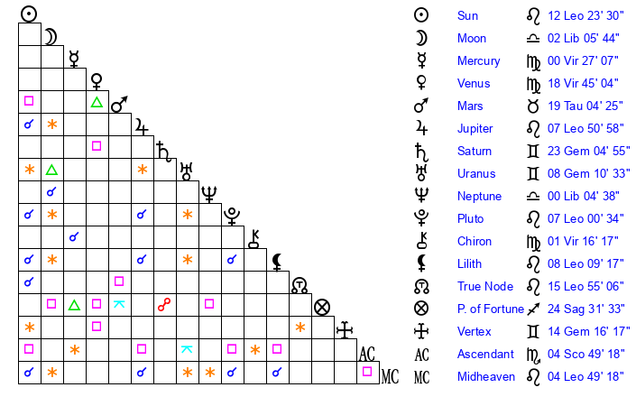 | Sun | 12 Leo 23 | 13 Leo 31 | 2 Scorpio 24 |