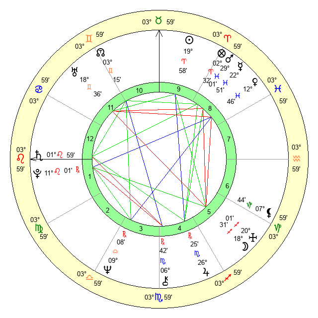 | Saturn | 2 Leo 27 | 25 Pisces 33 | 8 Leo 0 |