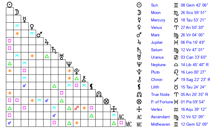 | Mercury | 18 Taurus 53 | 10 Gemini 12 | 16 Virgo 33 |