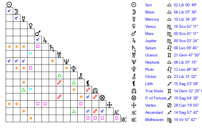 | Sun | 2 Libra 1 | 2 Libra 53 | 21 Sagittarius 6 |