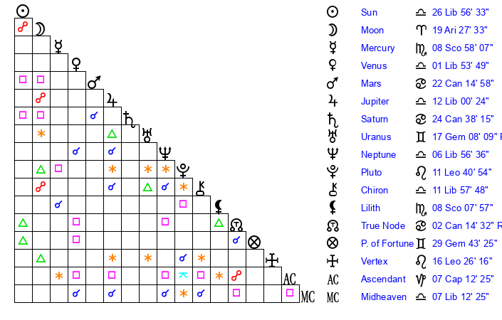 | Sun | 26 Libra 56 | 27 Libra 33 | 17 Capricorn 50 |