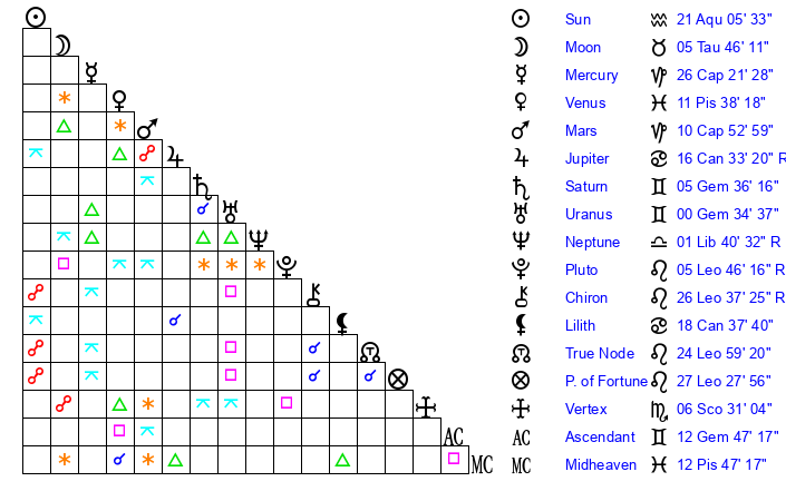 | Sun | 21 Aquarius 6 | 22 Aquarius 12 | 12 Taurus 23 |