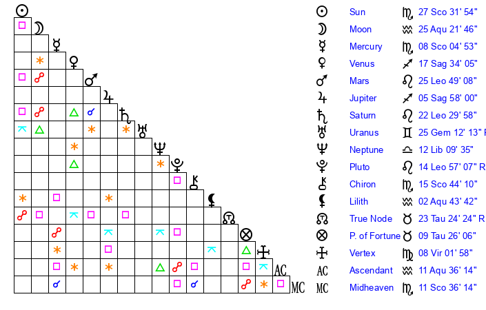 | Sun | 27 Scorpio 32 | 28 Scorpio 37 | 16 Aquarius 50 |