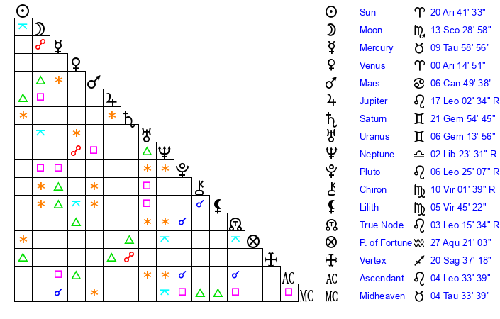 | Sun | 20 Aries 42 | 21 Aries 4 | 8 Cancer 45 |