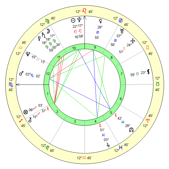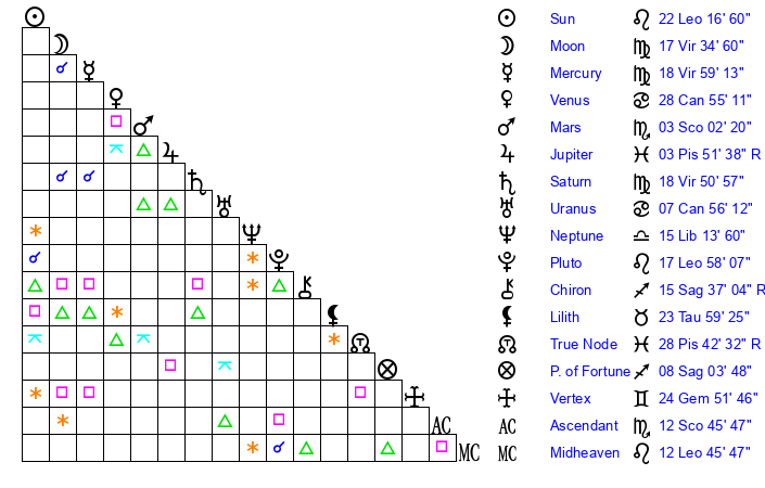 | Moon | 17 Virgo 38 | 16 Taurus 15 | 17 Gemini 37 |