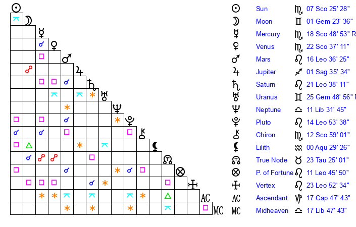 | Sun | 7 Scorpio 26 | 8 Scorpio 31 | 26 Capricorn 30 |