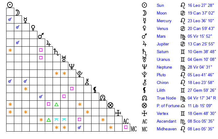| Moon | 19 Cancer 41 | 22 Aquarius 9 | 1 Leo 36 |