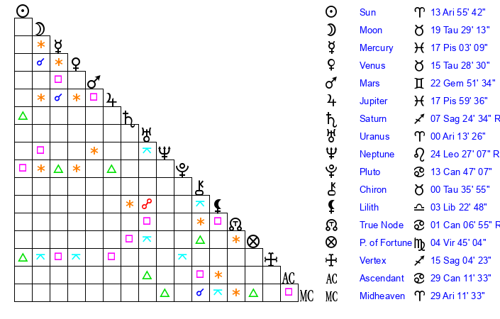 | Sun | 13 Aries 56 | 15 Aries 10 | 18 Cancer 23 |