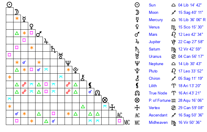 | Neptune | 14 Libra 30 | 0 Aries 37 | 16 Libra 58 |