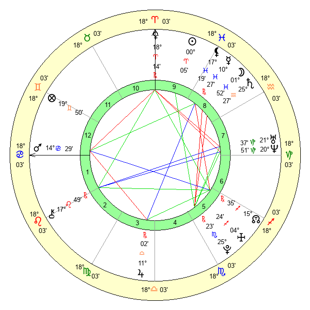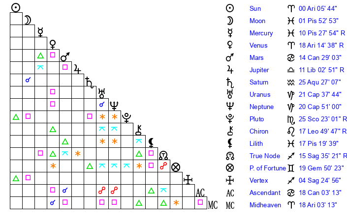 | Moon | 1 Pisces 45 | 10 Sagittarius 10 | 28 Aries 27 |