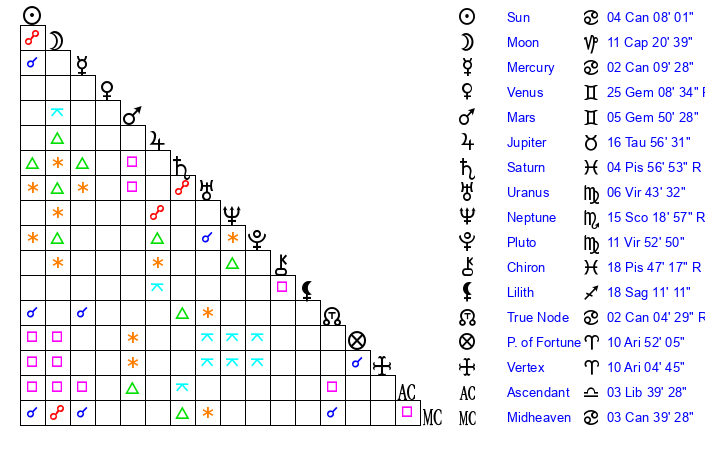 | Moon | 11 Capricorn 24 | 8 Cancer 1 | 2 Aries 39 |