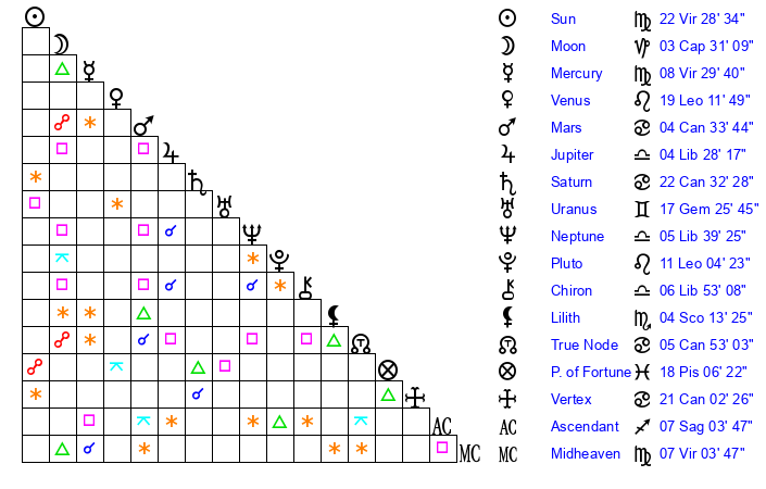 | Sun | 22 Virgo 28 | 23 Virgo 6 | 12 Sagittarius 12 |