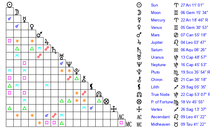 | Moon | 6 Gemini 14 | 19 Sagittarius 7 | 11 Virgo 19 |