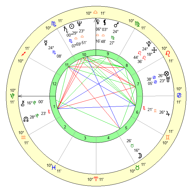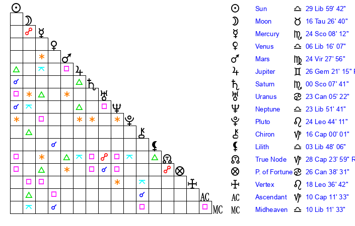 | Neptune | 23 Libra 52 | 29 Pisces 57 | 25 Libra 54 |