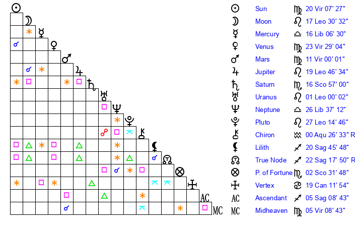 | Sun | 20 Virgo 7 | 21 Virgo 9 | 29 Scorpio 37 |