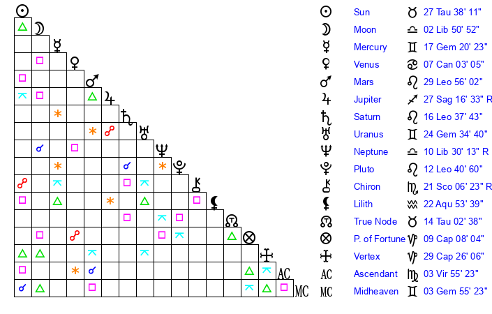 | Sun | 27 Taurus 38 | 28 Taurus 0 | 11 Leo 14 |