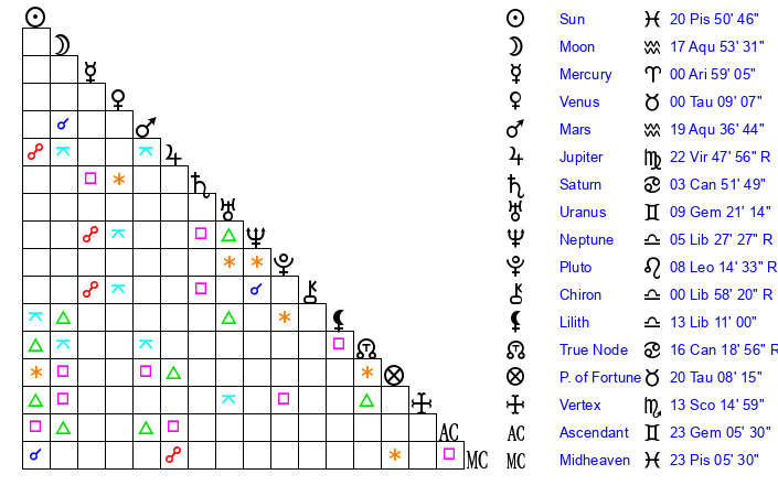 | Neptune | 5 Libra 28 | 29 Pisces 17 | 3 Libra 43 |