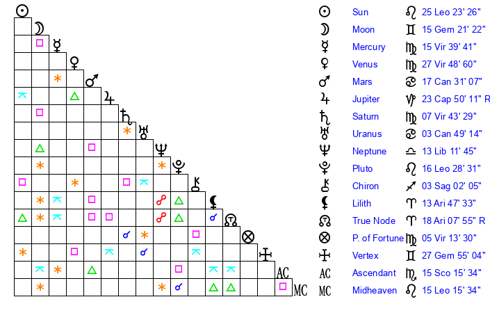 | Sun | 25 Leo 24 | 26 Leo 0 | 9 Scorpio 57 |