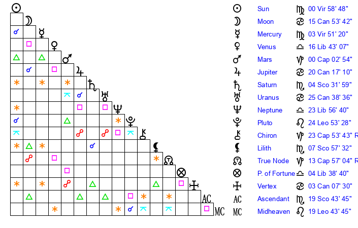 | Venus | 16 Libra 43 | 28 Cancer 50 | 28 Scorpio 25 |
