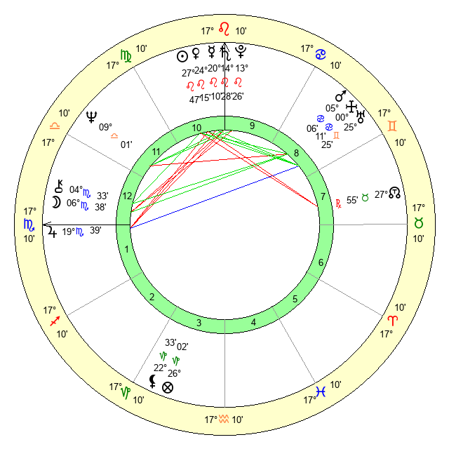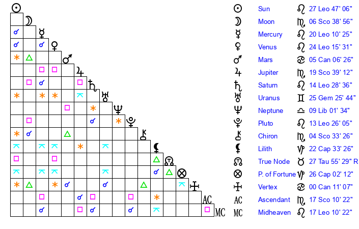 | Moon | 6 Scorpio 49 | 9 Leo 47 | 10 Virgo 28 |