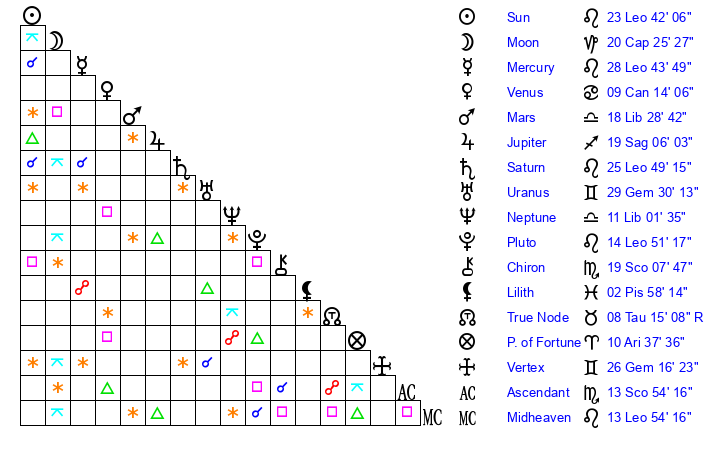 | Saturn | 26 Leo 15 | 0 Aries 51 | 4 Virgo 51 |