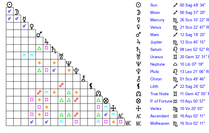 | Sun | 0 Sagittarius 49 | 1 Sagittarius 39 | 21 Aquarius 7 |
