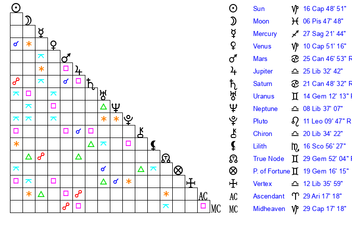 | Moon | 6 Pisces 48 | 27 Aries 1 | 26 Capricorn 12 |