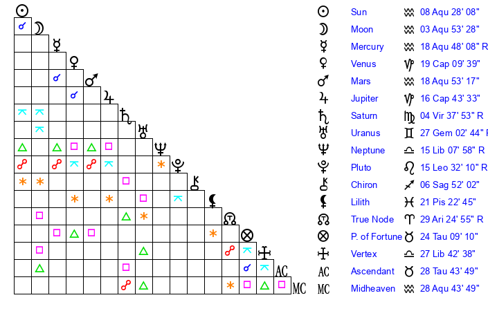 | Jupiter | 16 Capricorn 39 | 11 Gemini 21 | 0 Aquarius 7 |