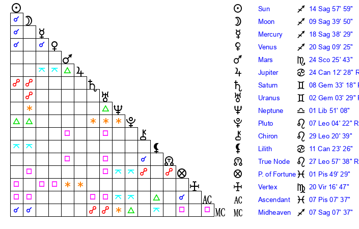 | Moon | 9 Sagittarius 34 | 23 Cancer 58 | 21 Sagittarius 35 |
