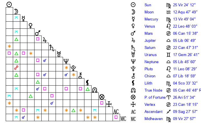 | Sun | 25 Virgo 24 | 26 Virgo 2 | 15 Sagittarius 15 |