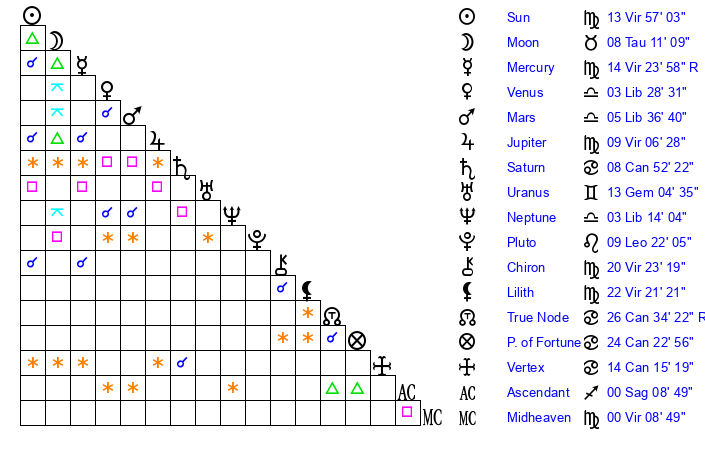 | Mercury | 14 Virgo 24 | 8 Virgo 1 | 23 Sagittarius 38 |