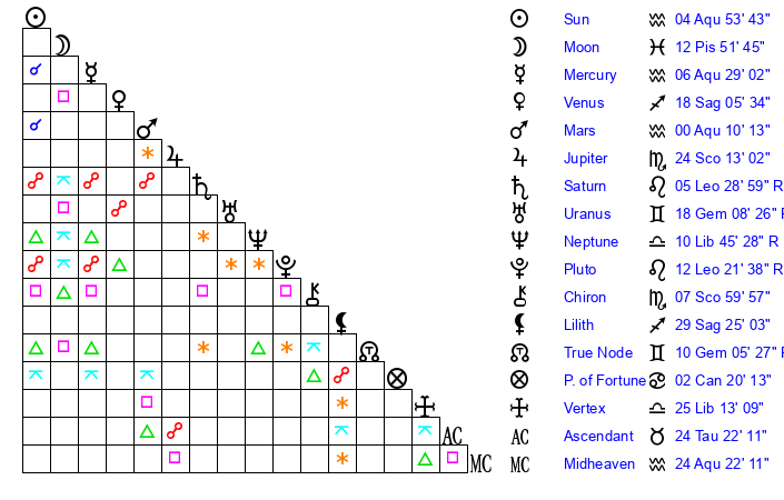 | Neptune | 10 Libra 45 | 27 Pisces 47 | 9 Libra 4 |