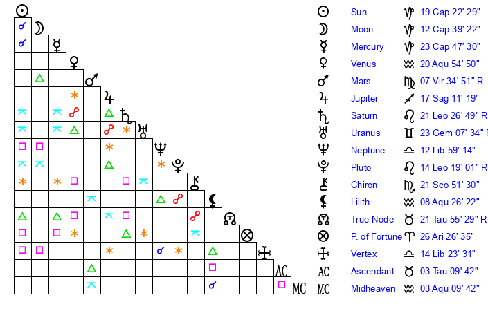 | Neptune | 12 Libra 59 | 29 Pisces 38 | 11 Libra 43 |