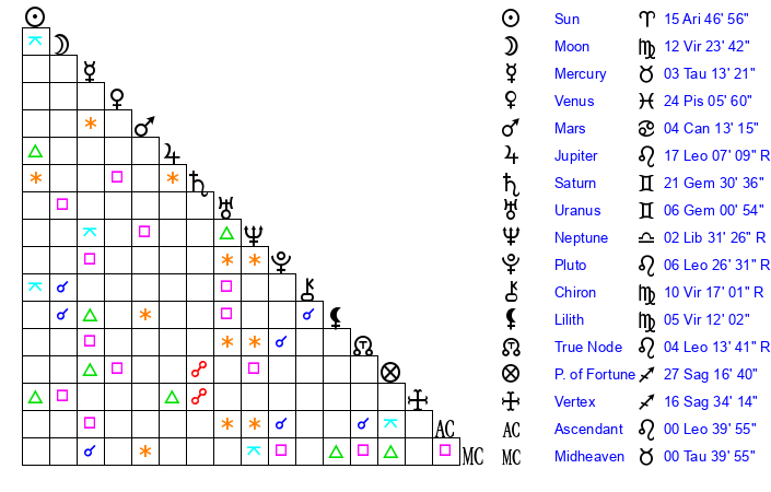 | Sun | 15 Aries 47 | 16 Aries 9 | 3 Cancer 59 |