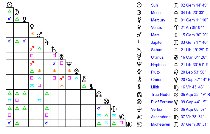 | Moon | 4 Libra 15 | 14 Aries 51 | 0 Gemini 58 |