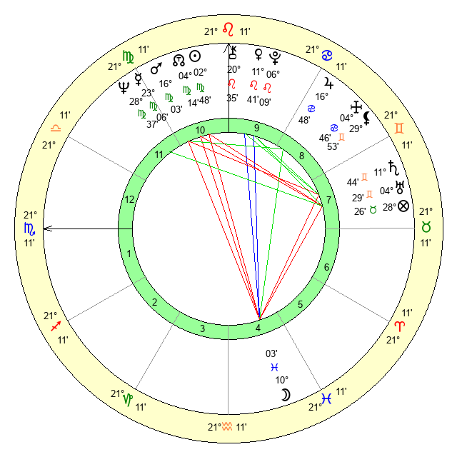 | Moon | 10 Pisces 0 | 13 Libra 44 | 24 Pisces 46 |