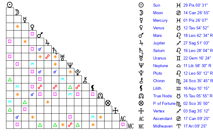 | Sun | 29 Pisces 0 | 29 Pisces 20 | 13 Gemini 57 |