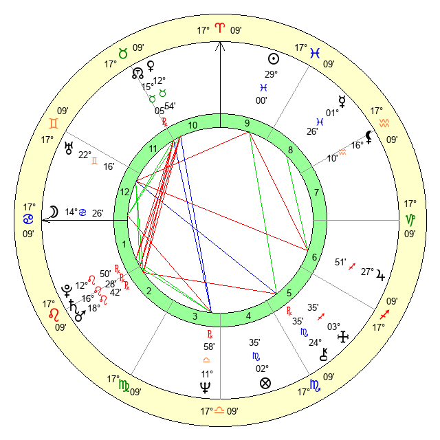 | Moon | 14 Cancer 36 | 28 Scorpio 12 | 8 Taurus 11 |