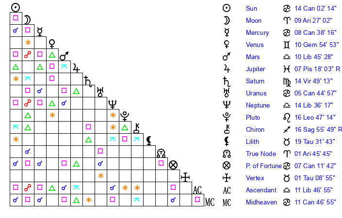 | Neptune | 14 Libra 36 | 2 Aries 10 | 16 Libra 19 |