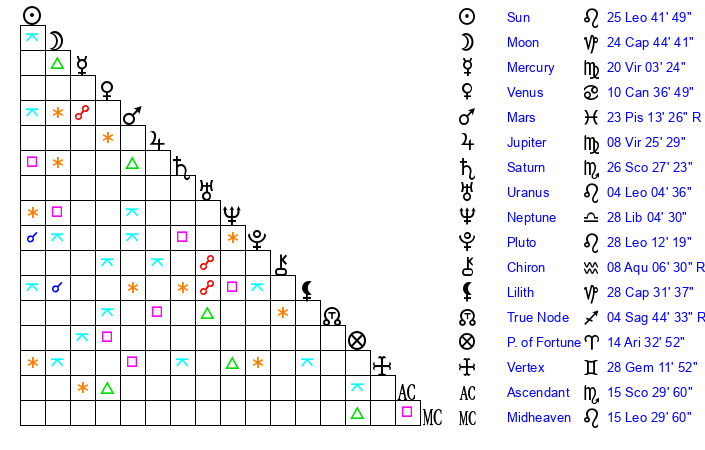 | Pluto | 28 Leo 12 | 2 Aquarius 1 | 0 Virgo 7 |