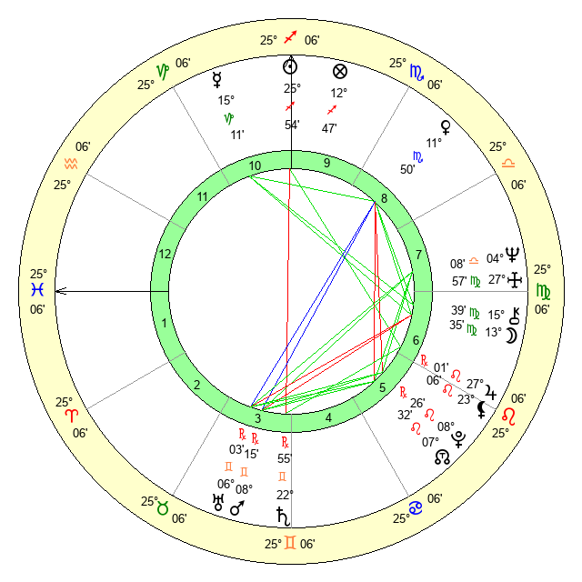 | Moon | 13 Virgo 31 | 12 Sagittarius 4 | 15 Virgo 36 |