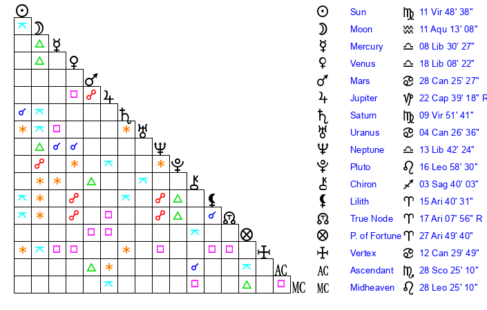 | Saturn | 10 Virgo 19 | 29 Pisces 38 | 18 Virgo 28 |