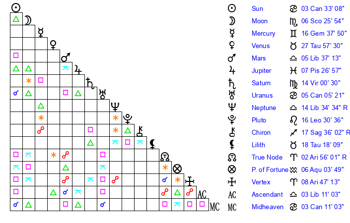 | Moon | 6 Scorpio 30 | 8 Cancer 1 | 2 Leo 20 |