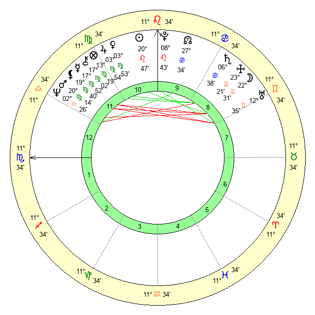 | Mercury | 17 Virgo 53 | 4 Leo 35 | 18 Scorpio 4 |