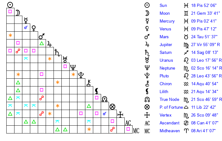 | Sun | 18 Pisces 52 | 19 Pisces 22 | 25 Taurus 32 |