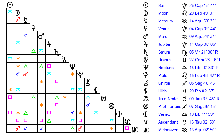 | Mercury | 14 Aquarius 53 | 12 Capricorn 9 | 1 Aries 56 |