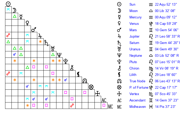 | Neptune | 3 Libra 53 | 28 Pisces 19 | 1 Libra 52 |