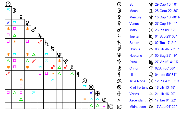 | Sun | 29 Capricorn 13 | 29 Capricorn 52 | 24 Pisces 42 |